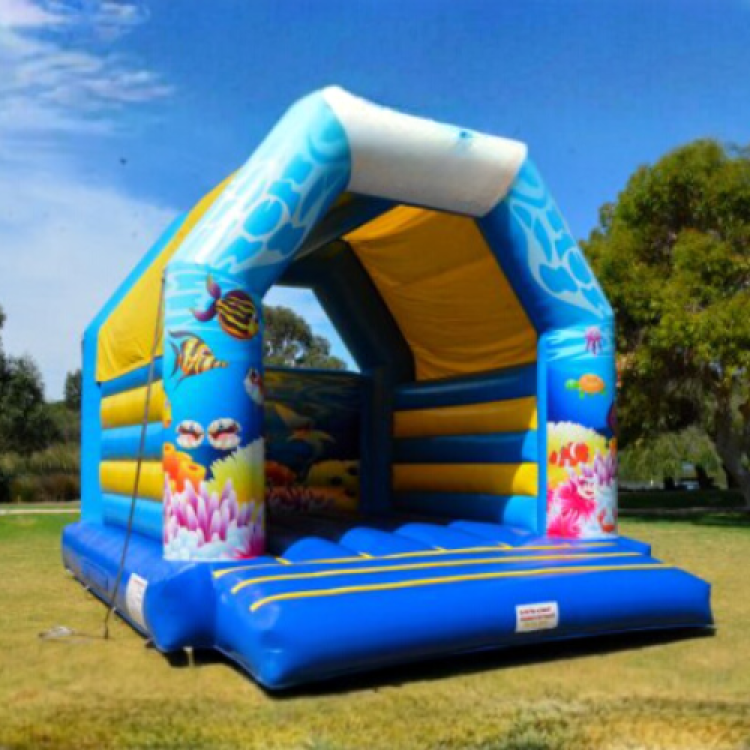 Ocean Jump is an ocean-themed inflatable jumping house with bright waves and sea creatures, offering a roomy, safe jumping area for kids, perfect for beach-themed events!