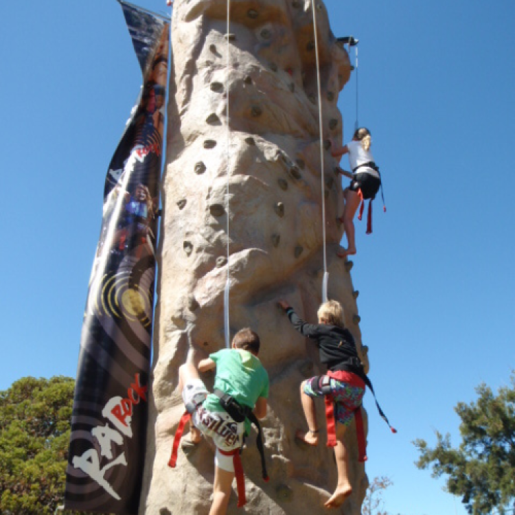 Our Rock Climbing Wall allows four people at once to climb the challenging 8 metre high wall. The wall has a realistic rock like appearance and even has dinosaur fossils throughout! The wall uses the safest climbing system available and is always a huge hit at any event.