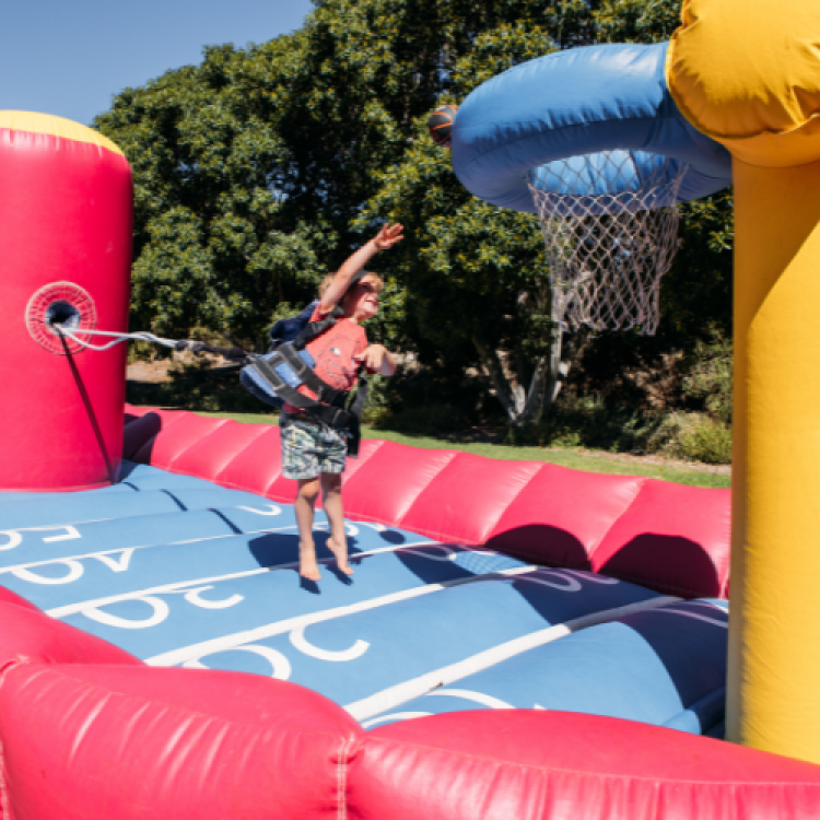 Strap into your bungee harness, line up against your opponent, and get ready for the ultimate showdown! As both players sprint toward the hoop, the bungee cords build tension, pulling you back and making every dunk a hilarious challenge. Only two players on the lanes at a time, with clear supervision to manage turns and keep the area safe.